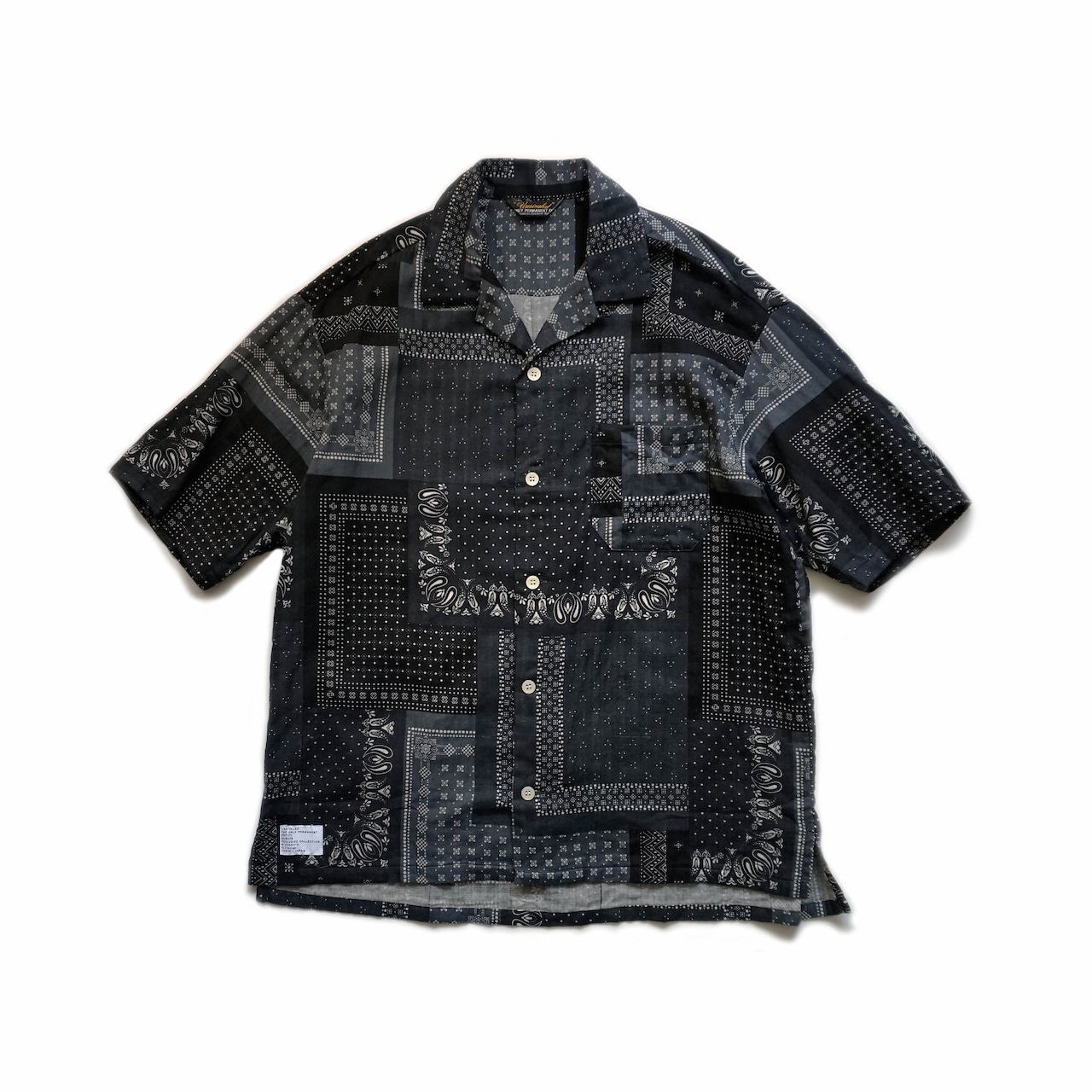 バンダナ柄がランダムにプリントされたダブルガーゼ生地が特徴的なオープンカラーSSシャツ。